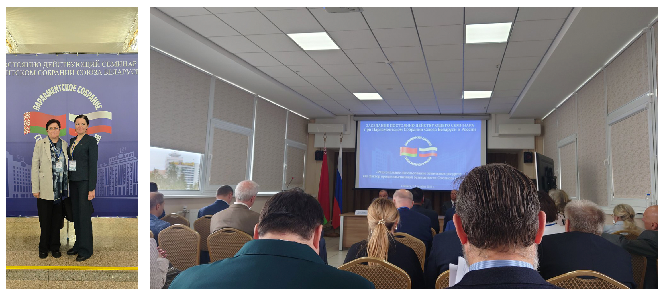 Ученый секретарь Т. А. Запрудская и ведущий научный сотрудник Е. В. Горбачёва 2–3 октября 2025 г. приняли участие в восемьдесят втором заседании постоянно действующего семинара при Парламентском Собрании Союза Беларуси и России «Рациональное использование земельных ресурсов как фактор продовольственной безопасности Союзного государства», где представили доклад на тему «Природно-экономические факторы повышения эффективности использования сельскохозяйственных земель». На семинаре обсуждались вопросы рационального использования земельных ресурсов в целях обеспечения продовольственной безопасности Союзного государства, правовые основы аграрной политики, механизмы межгосударственного и национального регулирования использования земель, экономические факторы их эффективного использования и распределения.